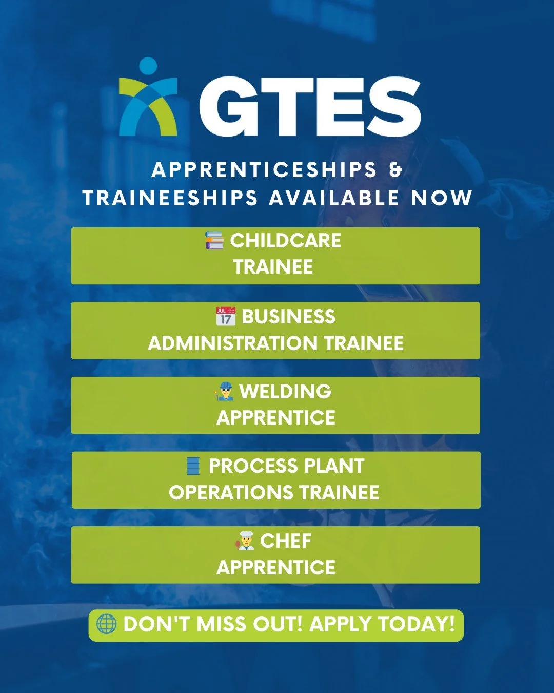 The GTES team takes care of all paperwork relating to the apprenticeship, including workersβ compensation, payroll, superannuation, leave calculations, Personal Protective Equipment (PPE), pre-employment medical checks and much more.